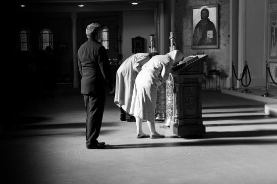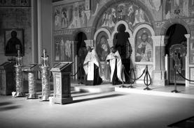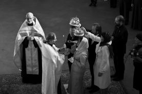 Eine russisch-orthodoxe Hochzeit in der Gemeinde des Hl. Johannes von Kronstadt in Hamburg. Die russisch-orthodoxe Auslandskirche (Emigrantenkirche nach der russ. Revolution) und das Moskauer Patriarchat sind erst vor wenigen Jahren wieder zu einer Kirche verschmolzen. Die von mir photographierte Hochzeit ist die erste von je einem Priester der ehemals getrennten und verfeindeten Kirchen gemeinsam vollzogene Trauung eines deutschen orthodoxen Brautpaares, noch dazu auf deutsch und auf slavisch.